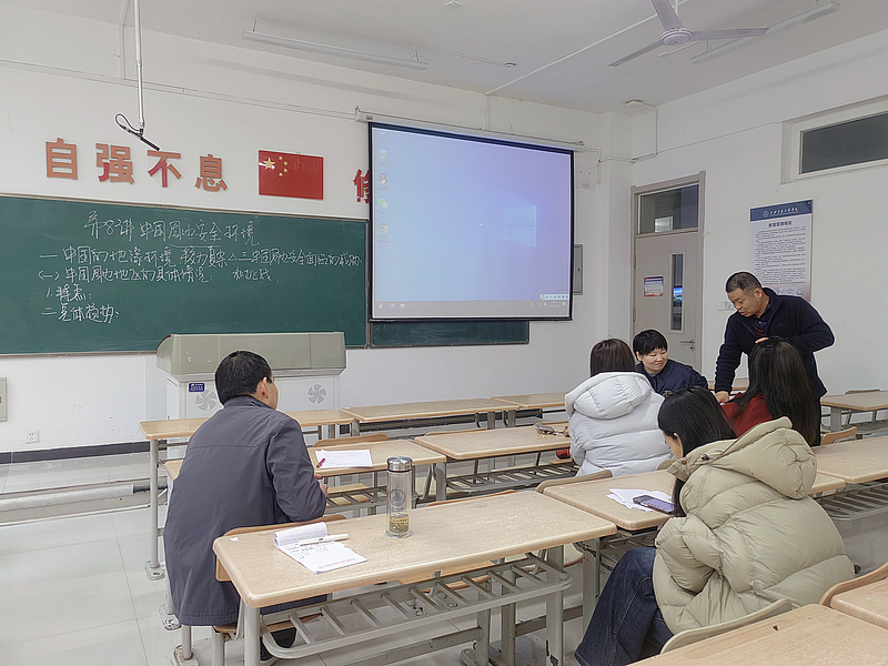 随后,冯宇老师进行了授课。她从中国的地缘环境出发,系统地讲解了中国所处的地理位置特点、面临的安全威胁和挑战等内容,总结出了中国周边安全环境的总体趋势。她精神饱满、教学方法灵活多样,充分展现了优秀中青年教师的良好风貌。