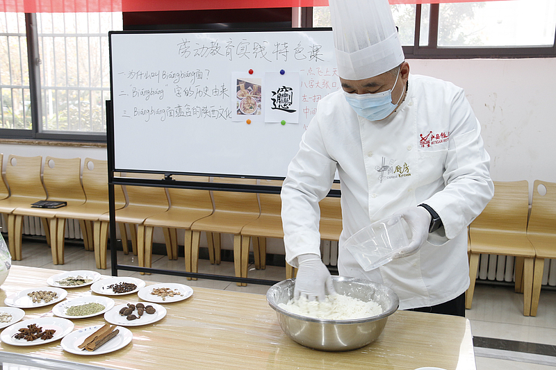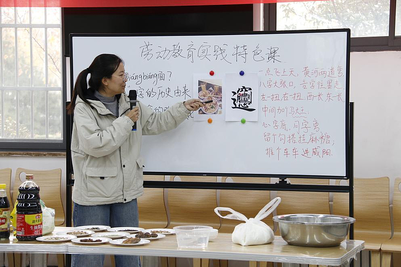 活动伊始,劳动教育教研室弓瑶老师以生动的讲解开启了课程导入环节,她详细介绍了biangbiang面的来历和背后深厚的文化底蕴,让同学们了解到这一传统美食的叫法源于声音,并蕴含着秦人豪爽精神,使学生们对接下来的制作环节充满了期待。