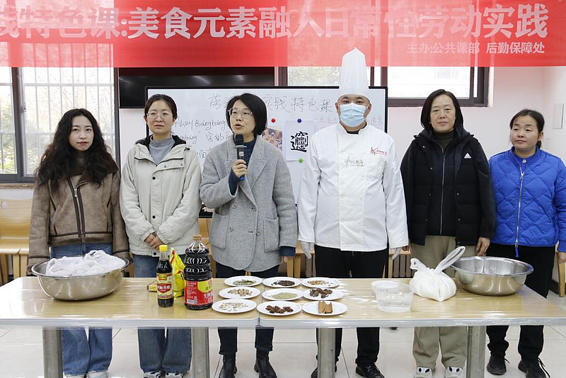 2025年12月3日,一场别开生面的劳动教育实践特色课在集贤楼教职工餐厅热闹开讲。本次活动由公共课部和后勤保障处联合主办,后勤处副处长马红梅、公共课部教学督导王小妮、劳动教育教研室全体教师,以及工程造价2403班全体学生等师生代表近50人共同参与,将美食元素巧妙融入劳动教育,让同学们在实践中感受劳动的魅力。