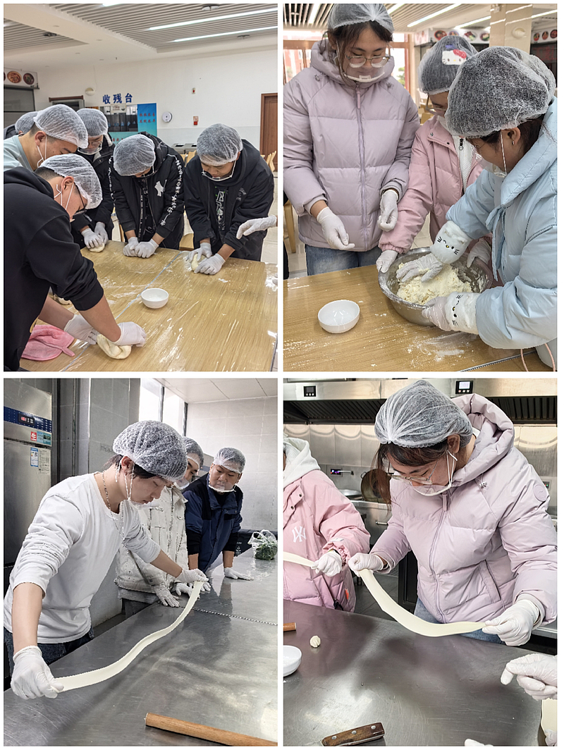 随后,餐厅大厨张经理亲自示范,为大家讲解专业的面食和肉臊子制作流程。大厨先介绍制作 biangbiang 面面条的材料,主要是面粉、水和盐,强调用高筋面粉,面条更有嚼劲。揉面时,大厨边示范边说要用力均匀,先大致混合面粉和水,再揉成面团,揉到“三光”。同学们专注观察。接着醒面,大厨提醒醒面约 40 分钟,这步很关键,能让面团更柔软有韧性。趁着醒面,大厨讲解肉臊子制作,展示所需材料,有猪肉、葱姜蒜、八角等。之后示范扯面,将醒好面团分成小块,搓条、擀片,双手拉扯,面条变长变宽,发出“biangbiang”声,这也是面名由来。同学们惊叹大厨技艺,迫不及待尝试。在大厨指导下,同学们分组制作 biangbiang 面,虽开始手忙脚乱,但在老师和大厨帮助下掌握技巧。不久,面条诞生,同学们煮面、捞面、浇肉臊子,一碗碗 biangbiang 面新鲜出炉。