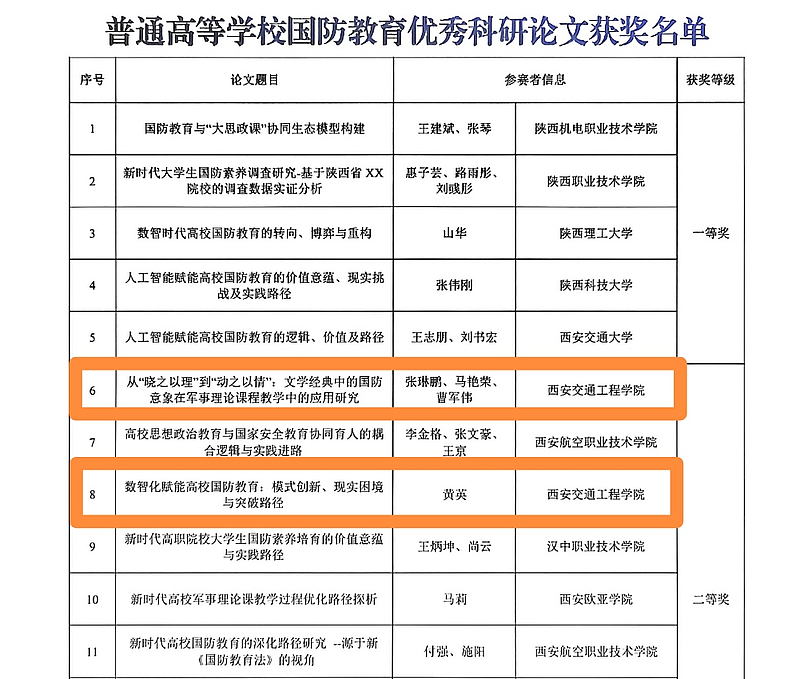 近日,陕西省教育厅主办的陕西2025年国防教育展示活动圆满结束。在普通高等学校国防教育优秀科研论文展示活动模块中,我校教师表现突出。该活动面向全省各级各类高校开展,每校限报两篇论文参赛。我校公共课部中文教研室张琳鹏、黄英两位教师提交的论文,均荣获省级二等奖。此系我校自开展国防教育以来首次获得该领域省级奖项,体现了我校在国防教育科研方面的扎实进展与集体智慧。